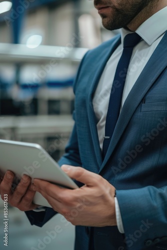 A man in a suit holds a tablet computer, suitable for business, technology and office use