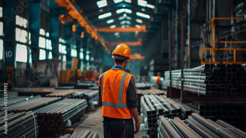 A man in a yellow vest stands in a large industrial building. He is wearing a hard hat and looking up at something. Scene is serious and focused