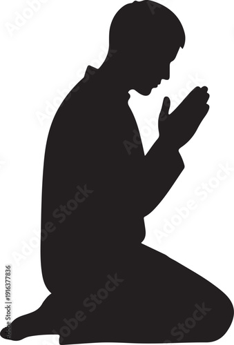 man, prayer, silhouette, kneeling, islam, muslim, faith, religion, spirituality, devotion, worship, black, white, background, monochrome, simple, icon, symbol, representation, figure, human, pose, posture, gesture, hand, head, body, vector, illustration