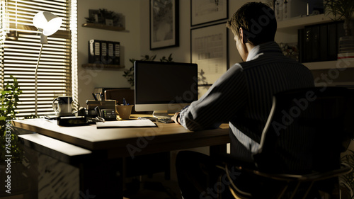 A man is sitting at a desk with a laptop and a potted plant. He is typing on the laptop and he is focused on his work. The potted plant adds a touch of greenery to the room. Concept of work from home.
