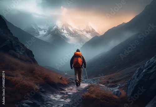 mountain, landscape, adventure, hiking, travel, person, man, peak, nature, hiker, trek, rock, sky, view, holiday maker, sport, tour tourism, top, active, trail, scenic, summer, young, beautiful, backpack, blue, walking, high, alone, freedom, lifestyle, scenery, climb, silhouette, cloud, green, adult, fog, hill, cliff, vale, sunrise, sunset, 1, male, achievement, background, vacation