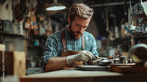 A man is working on a project in a workshop. He is wearing a plaid shirt and a leather apron