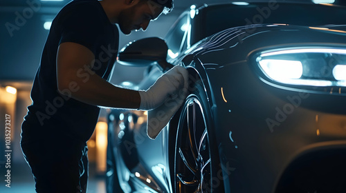 A man polishing a luxury car with a microfiber cloth, focusing on cleaning -