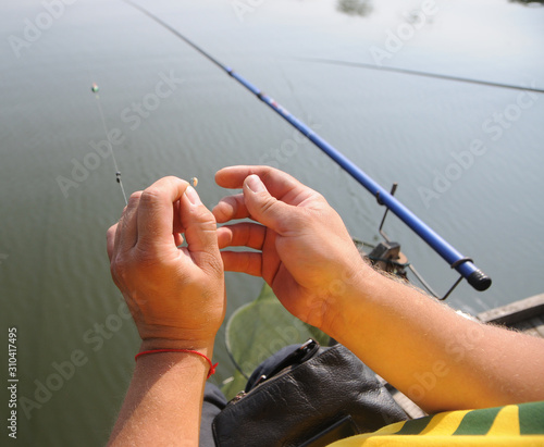 A man puts bait on a fishing rod during summer fishing in Kiev, August 26, 2017