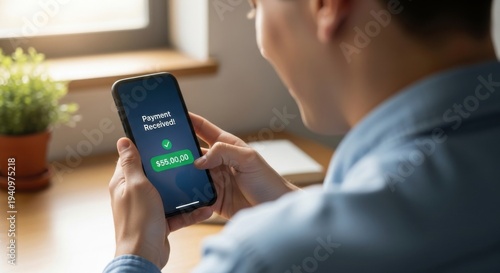 payment, notification, smartphone, phone, mobile, banking, finance, money, transaction, online, digital, technology, business, office, desk, window, plant, green, screen, display, message, alert, confirmation, success, secure, cash, income, revenue, growth, investment, e-business, hand