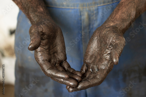 A man shows his dirty hands after a day of work. Equipment and car repair.