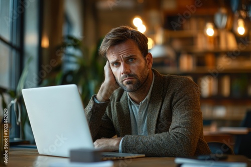 A man sits at a table in a cafe, looking tired and frustrated while working on his laptop.