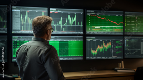 A man standing in front of a wall of computer screens. The screens are displaying various data visualizations, including graphs, charts, and maps