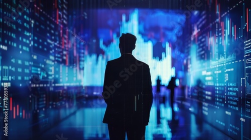 A man stands in front of a computer screen with a blue background and red and white lines. The man is wearing a suit and he is looking at the screen. Concept of focus and concentration