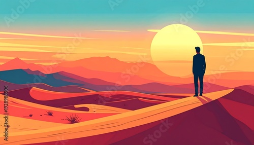 desert, sunset, man, silhouette, sand, dune, mountain, sky, sun, orange, red, blue, yellow, calm, serene, peaceful, landscape, nature, scenery, view, horizon, figure, standing, alone, still, quiet, contemplation, huge, expansive, arid, dry, warm, colourful, vibrant, illustration, digital, art, graphic, design, abstract, stylised, simplistic