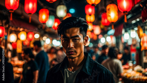 A man stares intensely amidst vibrant red lanterns in a bustling night market. He wears dark clothing, conveying a serious mood.