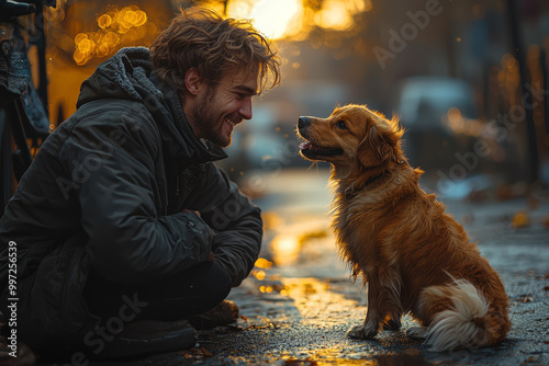A man stopping to play with a stray dog, smiling as the dog wags its tail in excitement.