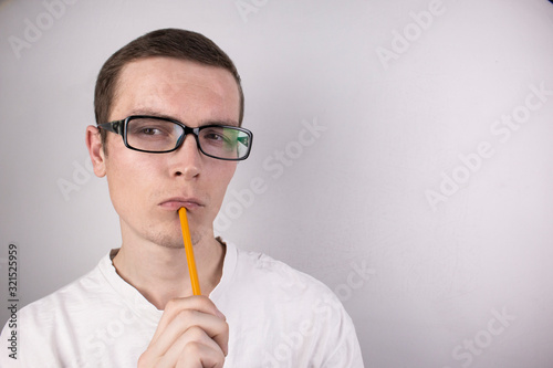 A man wearing a white T-shirt, glasses with transparent glasses and a black frame, with a thoughtful expression of his face presses a yellow pencil against his lips