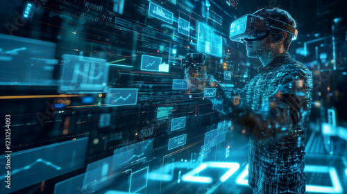 A man wearing VR headgear playing a game while in his room full of data technology graphics layered