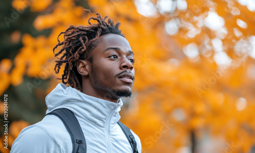 man, dreadlocks, beard, standing, front, tree, orange, male, white, leaf, wearing, jacket, backpack, person, black, lifestyle, american, young, guy, portrait, adult, photogenic, outdoors, happy, photogenic, outside, cheerful, attractive, style, city, face, looking, expression, serious, positive, casual attire, cool, trendy, street, beautiful, smile, nature, ethnicity, fashion, confident, model, urban, modern, happiness