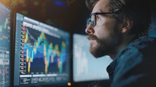 A man with glasses focusing on three computer screens in a modern office setting.