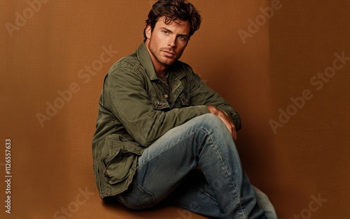 man, model, studio, green, bomber, jacket, jean, black, hair, brown, fashion, casual attire, clothing, photoshoot, sitting, person, guy, photogenic, 1, to sit, looking, face, lifestyle