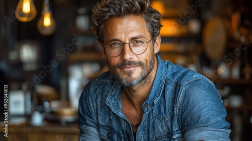 A man with stylish glasses and casual attire smiles warmly in a rustic café during the afternoon