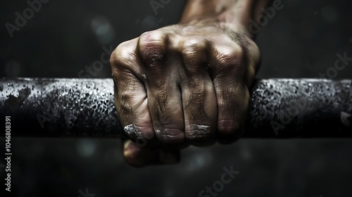 A man's hand gripping a metal bar. The hand is strong and muscular, with veins bulging out.