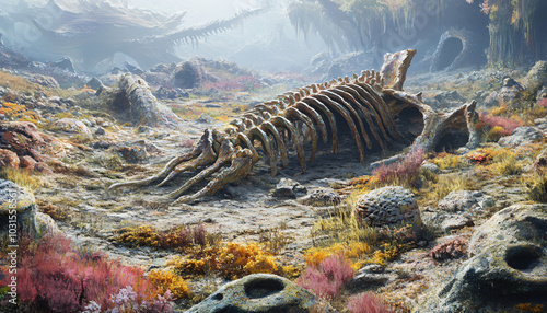 A massive dry seabed covered with the fossilized remains of giant, prehistoric marine creatures and corals