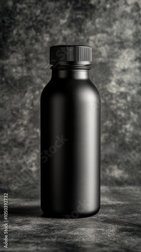 A matte black bottle is elegantly displayed on a metallic gray surface, highlighting modern design