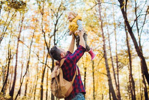man, mature, male, photogenic, attractive, beard, moustache, father, father, father, eltern, son, small, little, children, children, childhood, offspring, toddler, boy, blond, cute, happy, family, people, together, human relationships, enjoying, walk, leisure, time, nature, forest, timberland, tree, sunny, day, autumn, fall, leaf, backpack, shirt, holding, love, standing, outdoors, outside, raising, lifting, air