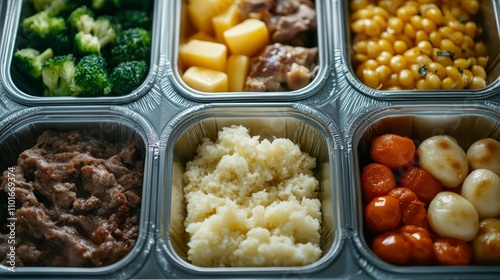 A meal tray featuring assorted foods including vegetables, meat, and grains.