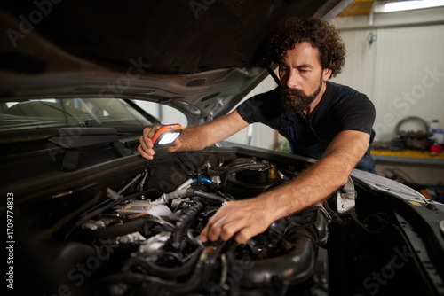 A mechanic inspects the engine of a vehicle in a repair shop, using tools to identify issues while taking readings and making adjustments during the afternoon.