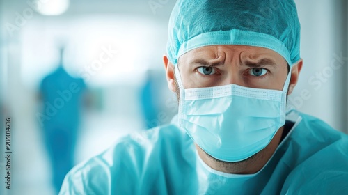 A medical professional, clad in protective scrubs and a surgical mask, is ready for a medical procedure, depicted in a bright and clean hospital environment with colleagues in the background.