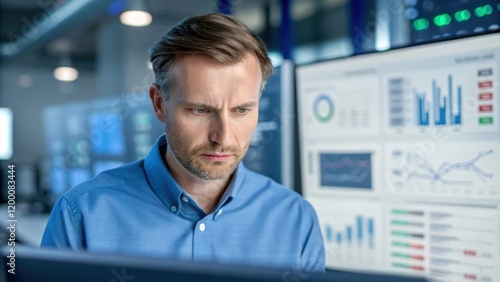 A medium closeup of a factory operations manager analyzing a screen filled with analytics and graphs related to the smart grids performance.