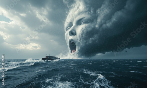 A menacing face forms in the clouds, its scream unleashing a fierce cyclone, as it tears through the ocean, threatening