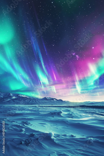 A mesmerizing display of the aurora borealis, with vibrant ribbons of green, purple, and blue light dancing across a starry sky above a pristine snowy landscape