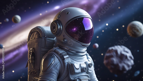 A mesmerizing, hyper-realistic visual representation of an astronaut alien in the space, intriguing, mystery, dark theme, majestic, galaxy, planets, created by generative ai