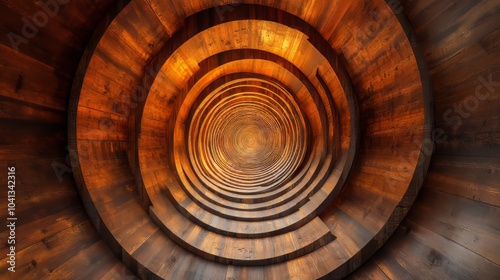 A mesmerizing view of a circular wooden structure, showcasing intricate patterns and a warm, inviting glow from the center, perfect for artistic projects.