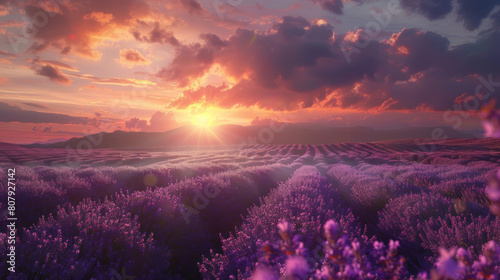 A mesmerizing view of a sunset over a field of lavender, the sky painted in shades of purple and gold as the day comes to a close.