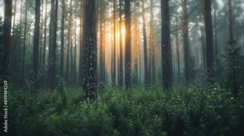 A mesmerizing view of lush green woodland bathed in soft sunlight, located in Karelia, Russia. The light filters through tall, dense trees, creating a serene and magical atmosphere.