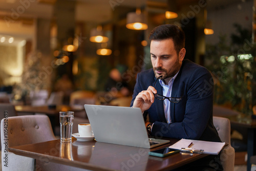 A mid adult Caucasian man in a tailored suit is immersed in his work on a laptop at a trendy cafe, with a coffee cup and eyeglasses close by.