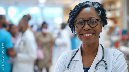 A middle-aged black female doctor smiles against the background of a busy hospital atmosphere, generative AI