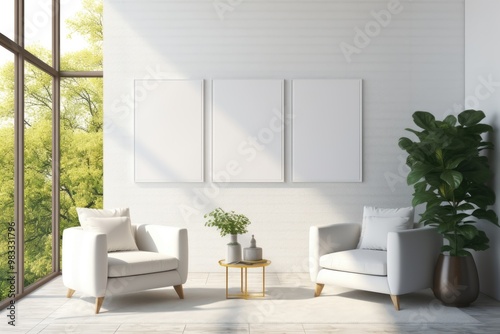 A minimal living room featuring a blank white canvas wall mockup, two cozy armchairs, and a small table with potted plants, illuminated by natural light from large windows