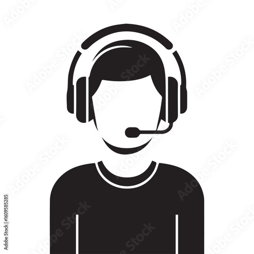 A minimalist black and white icon illustration of a customer service representative wearing a headset.