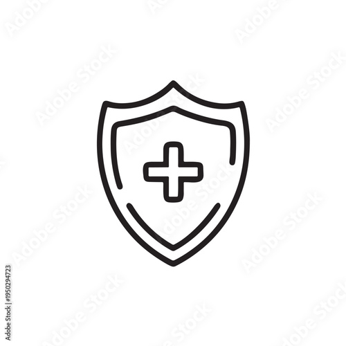 A minimalist black line art icon of a medical shield symbol on a plain white background surface Vector, illustration