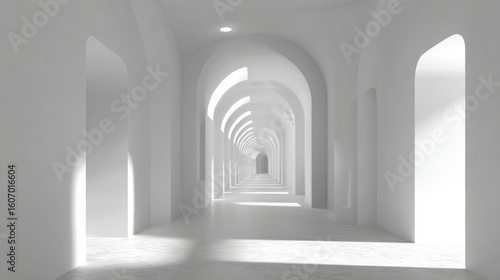 A minimalist corridor featuring archways with soft lighting, creating a serene and open space.
