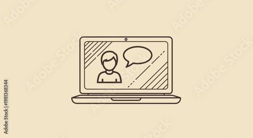 A minimalist illustration depicts a laptop screen displaying a person s head and a speech bubble