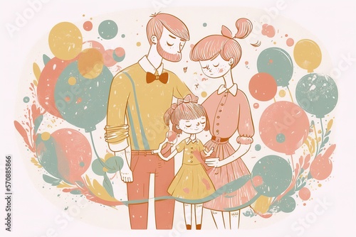 a minimalist illustration of a happy loving family with kids, portrait in pastel colors