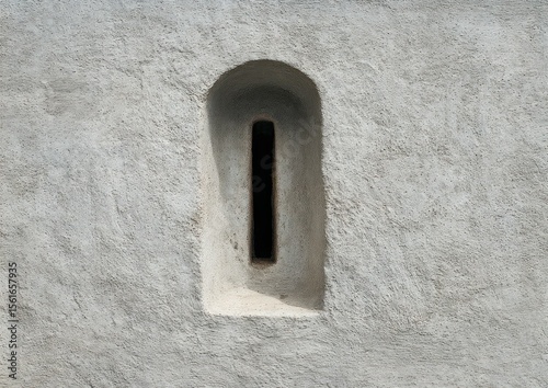 A minimalist image of a weathered wall with a vertical narrow window aperture detail