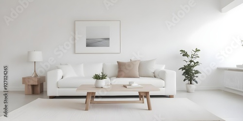 A minimalist living room with a white sofa, a wooden coffee table, and a white wall with framed artwork.