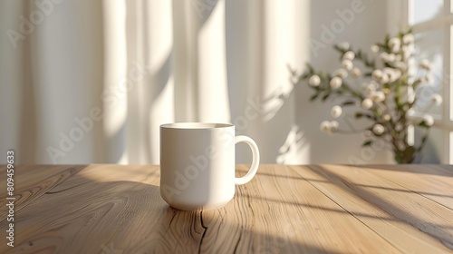 A minimalist mockup of a blank coffee cup on a wooden table, soft natural lighting