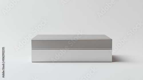 A minimalist, rectangular metallic silver box with sharp edges, placed on a white background
