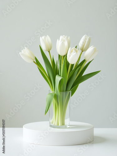 A Minimalist Setup Features A White Pedestal Holding A Bouquet Of White Tulips Against A Soft, Airy Background.