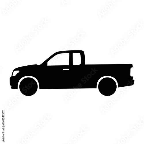 A minimalist vector illustration depicts a black pickup truck in profile view, showcasing its simple design against a clean white background, ideal for transportation themes.